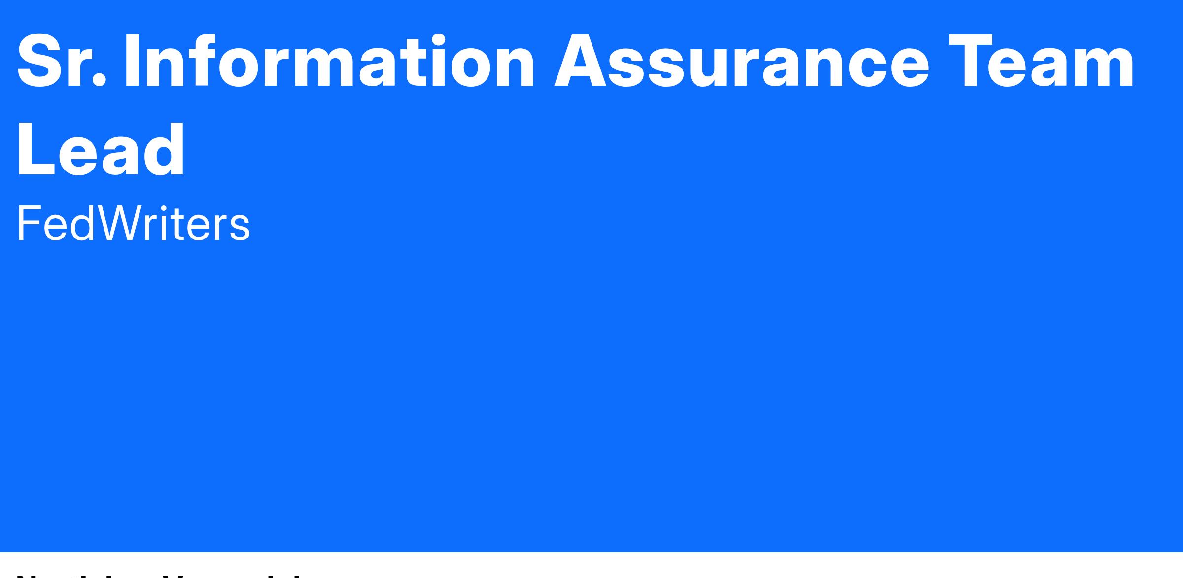 FWI is building a team to support NNSA's cybersecurity mission by providing Information Assurance services to protect the Nation, our allies, and our partners through a resilient and responsive nuclear security enterprise. As a Sr. Information Assurance Team Lead, you will lead a team of cybersecurity subject matter experts providing management support focused on Information System Security Officers and Information System Security Managers while ensuring internal processes meet federal requirements and contractual obligations.